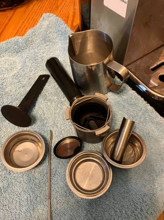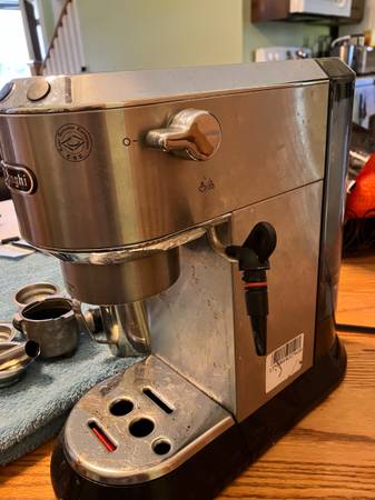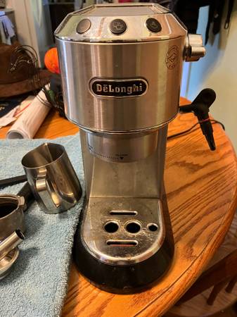 De’Longhi Dedica Espresso Machine. The lattes you can make with this machine are not any different than one you'd get at Starbucks. It will of course also make espressos, etc. I purchased it a year ago and have used it around 20 times. I have descaled it once. It comes with frothing cup, all of the attachments.