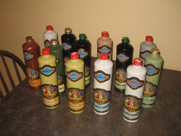 Vintage Jim Beam Beameister and Melkmeister ceramic wine bottles - 13 total. Dates: 1975, 1977, 1980. Colors: black, blue, light green, dark green, brown, mustard, light gray, dark gray, mauve, white. $2 each. Vintage Black Tower ceramic wine bottles - 2; 1979; black. $2 each. Will make a great gift for family or friends.