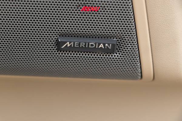 The interior features almond tan leather seating with a matching dash, center console, and door panels. Amenities include power-adjustable, heated seats front and rear seats, front dual zone automatic climate control, rear climate control package, three sun roofs, rear view camera, and a Meridian sound system