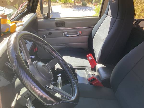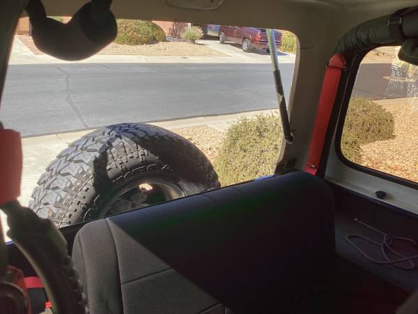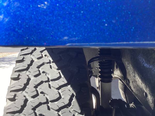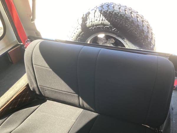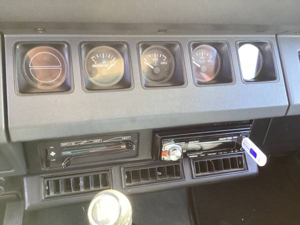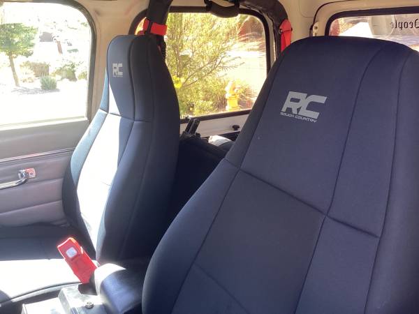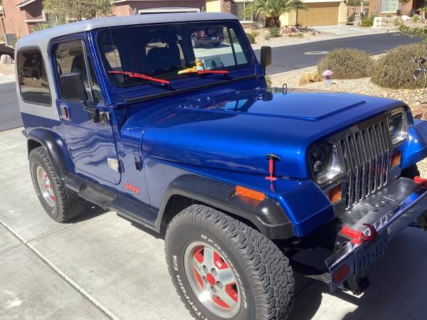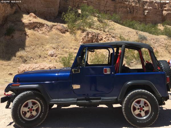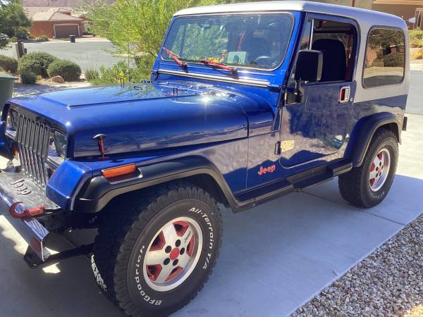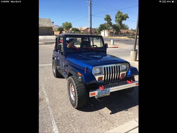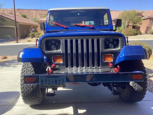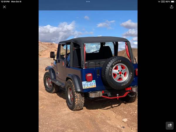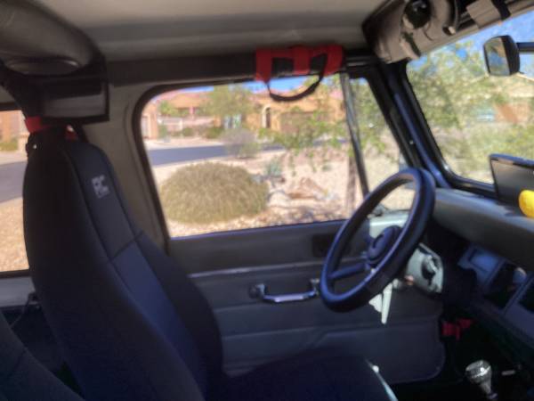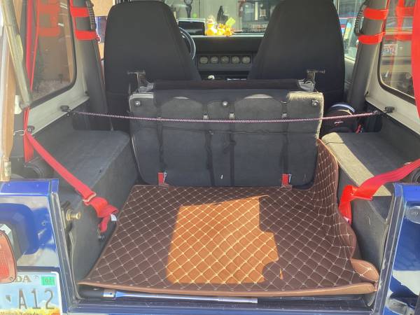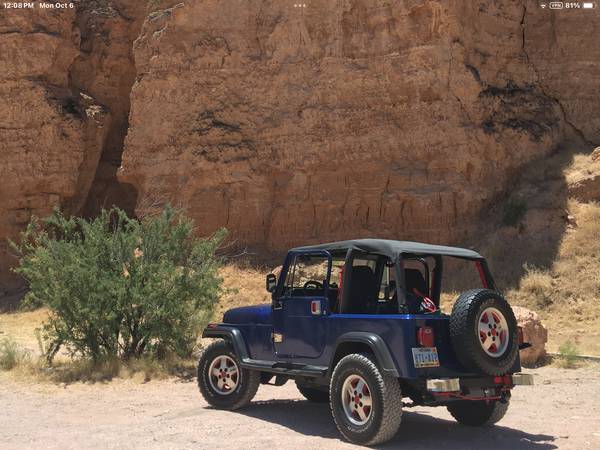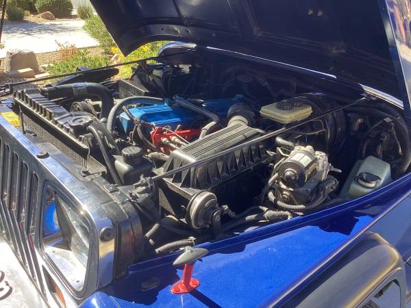 Engine burns no oil, runs smooth. No rust. Corvette blue and silver paint. Double capacity battery. Rough country seat covers. New seat belts, new visors. Blu tooth radio and brand new CB radio. New shocks, new spare tire. Boomerang shackles for smoother ride. Magellan GPS, 7” screen. Led lights all around. New plugs, wires, rotor and distributor cap. Includes Bimini canvas top for summer use. It has power steering, power brakes, tilt wheel and everything for air. I have never used air as the hard top was always removed in summer (air will need servicing). Redline oil in transmission and transfer case. New steering stabilizer. Have original manuals and Chilton repair manual. Steering is tight and tracks straight. B F Goodrich tires run quiet, spare is new Goodyear Wrangler. Has overhead roll-bar speakers that work great. Gets compliments where ever I go! Cheaper than razzr , side by side or golf cart and can drive anywhere!