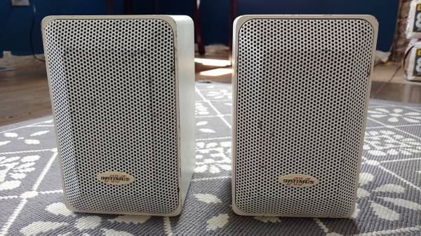 The Realistic Pro 7AV speakers were made from 1994-1998. They use the same components as the earlier Minimus 7 speakers, with a cast aluminum enclosure, long-throw 4" woofer, and 1" soft dome tweeter. Equally at home with stereo listening in small spaces, ready for use as easily concealable surround sound speakers, or up to the task of providing ambiance outdoors. They come with keyhole wall mounts on the back, and are also threaded for many other styles of mounting. Frequency response is 120 Hz - 20 kHz and recommended power is 40 watts RMS or 80 watts max. This pair work great and sound quite good for their diminutive size. The white painted exteriors have a few scuffs, but nothing that changes the way they function.