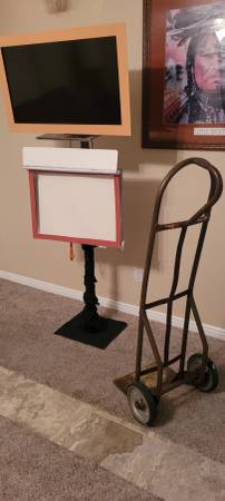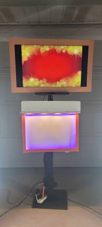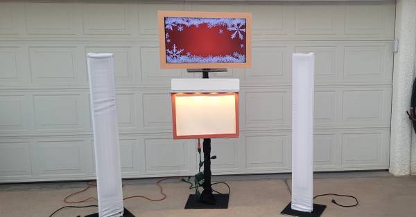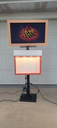 Duel display stand with 2 sources of image display. Top LED/TV with multiple import port sources. Lower panel with multiple lights, encased in a metal box frame design to support magnetic signs and material.