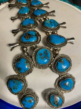 I bought years ago but have never worn. 19.4 oz. I have lost my original purchase info so can’t tell you the turquoise mine but it’s beautiful nonetheless. I also can’t find the mark usually put on by the silversmith and have photographed the backside so maybe you can. I’ve never polished it as I prefer the tarnished look and I prefer blue turquoise with matrix. Price is firm.