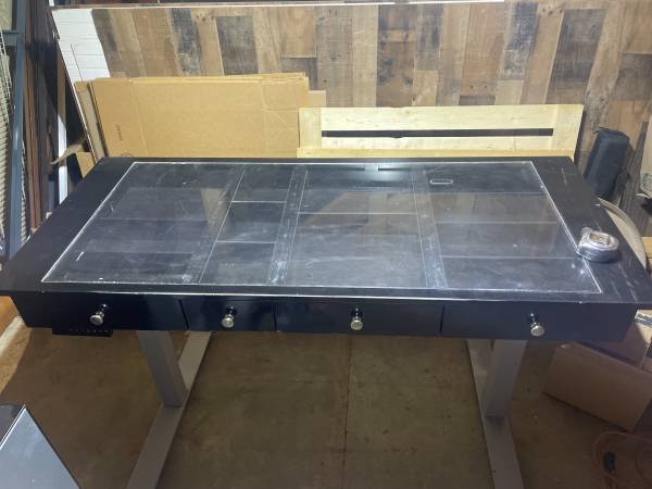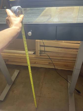 A standing office desk with hydraulic adjustable legs, its measurements are: Length: 4ft 10 inches (58 inches) Width: 2ft 1 inch (25 inches) Min height: 2ft 10 inches (32 inches) Max height: 4ft 3.5...