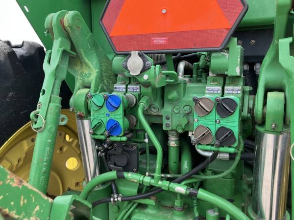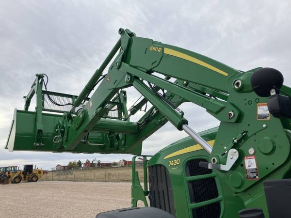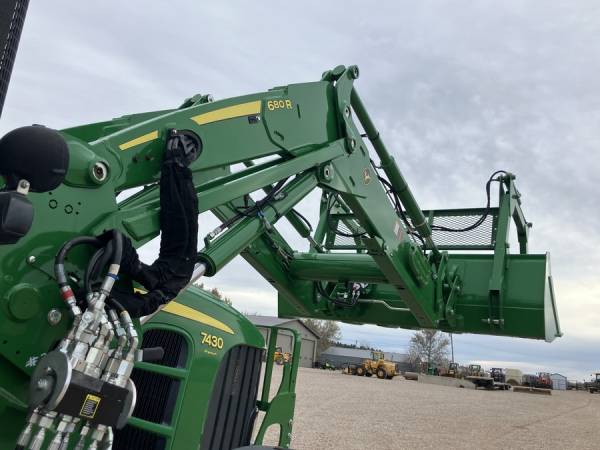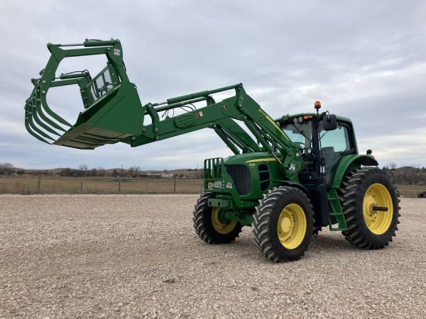 2012 John Deere 7430 Premium, MFWD, 165hp, 3025 one-owner hours, 20 speed power quad with LH reverser, new JD 680R SL loader, new bucket and grapple, joystick with thumb control 3rd function, 4 remotes, 540/1000 pto, 3pt with quick hitch, duals, new Firestone rubber, 2 doors, mirrors, foot throttle, front fenders, auto steer ready, immaculate, one-owner farm tractor! Last of the pre-emissions tractor series!