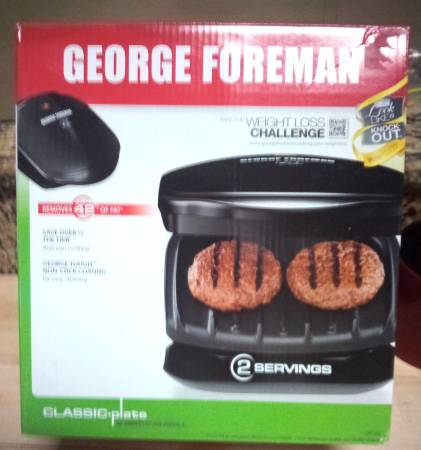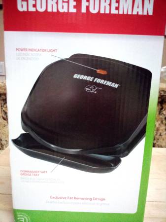 George Foremen small 2 serving non-stick grill. Brand new, never used, in box. Size: 9.4"D x 5.78"W x 10.27"H