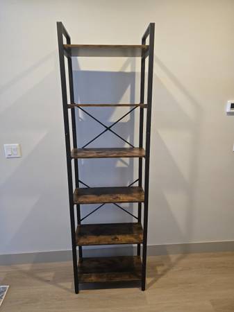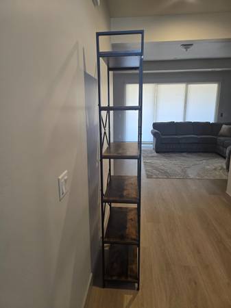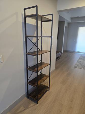I have 2 nice metal frame shelves with wood shelving. $50 each.