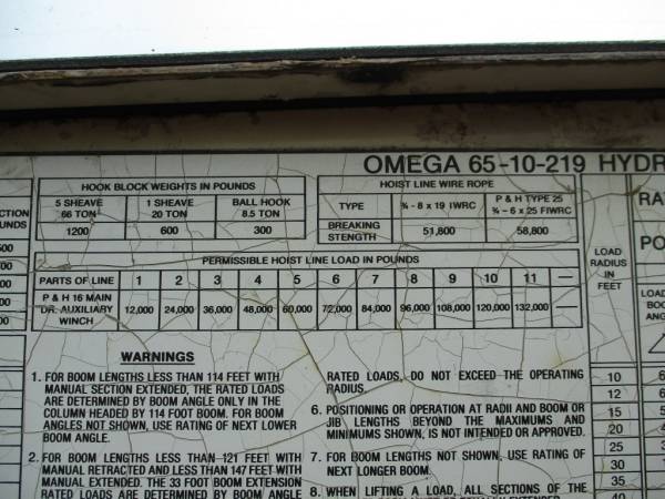 Up for sale is a 1982 P&H Omega RT651 Rough Terrain Crane. 4x4, 65-Ton Capacity, 2013 Deutz 6-Cyl 325hp Tier 3 Repowered Diesel, 3-Speed Powershift, 4-Section Boom, 114' Max Reach, Hydraulic Out-Riggers, Ball Hook, Hook Block, Cab W/AC, 29.5-25 Tires, **Includes 34' Multi-Section Lattice Jib. S/N: 22J1451D2. Please take a good look at the pictures and call with any questions.