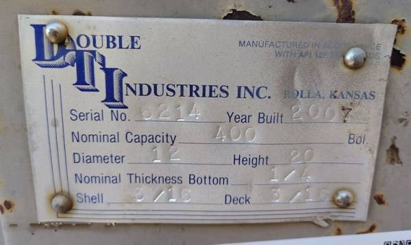 Up for sale is a 2007 DTI Double T 400 BBL Water Tank 12 ft Condensate. This 400 BBL Tank has a 12 ft diameter and a height of 20ft. Nominal bottom thickness 174 shell is 3/16 steel and deck is 3/16th. Has 4 inch outlets. Please call with any questions.