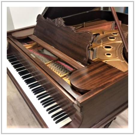 This Steinway & Sons Victorian model grand piano was fully restored by a nationally known rebuilder in 2010 and is in extraordinary condition. It has a finely detailed African ribbon mahogany finish with lovely brass embellishments and the famous “ice-cream cone” legs that give the piano exquiste style and grace. Steinway model A pianos are popular with musicians, artists, institutions and homes where a larger piano is needed, but not one so large as to be imposing. The piano showcases the Steinway American tone from bass to treble with a finely adjusted action. It is a joy to play. As is our practice with all of our used Steinways, we have priced the piano considerably lower than a comparable new model. The purchase comes with: