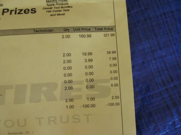 Two virtually new tires for $100.