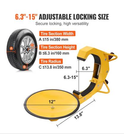 Fits Most Tire Size: Our wheel clamp lock fits a wide range of tire sizes, ranging from 6.3 to 15 inches (160-380mm), securely locking the tire in place. It is suitable for most tire sizes, requiring the tire's section width within the 6.3-inch range and the radius within the 13.8-inch range.
