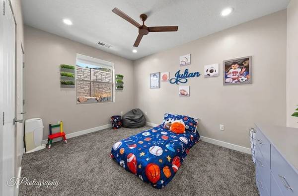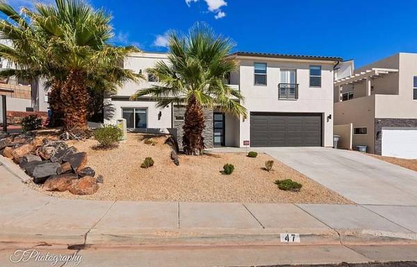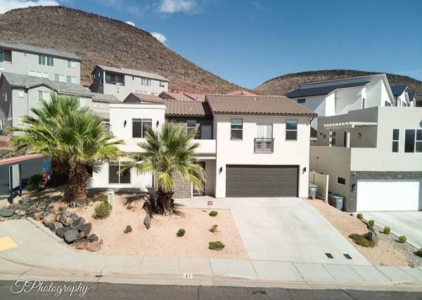 Gorgeous modern home with stunning views of Red Cliffs and the Valley from the deck. Beautiful kitchen features custom cabinets, large island, stainless appliances, and a spacious pantry. Open floor plan highlights an elegant staircase with custom handrailing. Main level offers a den/bedroom and three-quarter bath. Upstairs boasts a quaint landing, wide hallways, and spacious bedrooms. The primary suite impresses with dual sinks, separate tub and shower, and a large closet. Upgraded fixtures and tasteful décor throughout. Rainshowers, two water heaters, water softener. Inviting backyard with covered patio. Advanced heating/cooling with three thermostats for comfort. Across the street from park and pond, near schools, medical, shopping, and Sand Hollow Aquatic Center. 2,508 square feet.