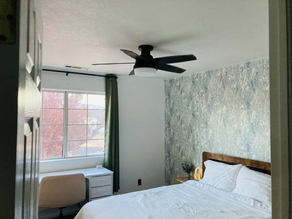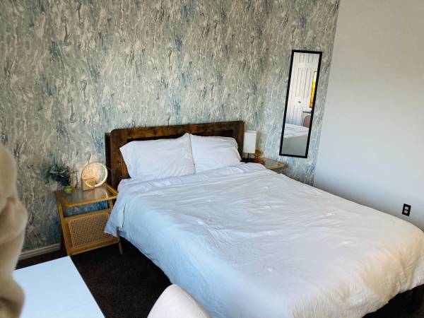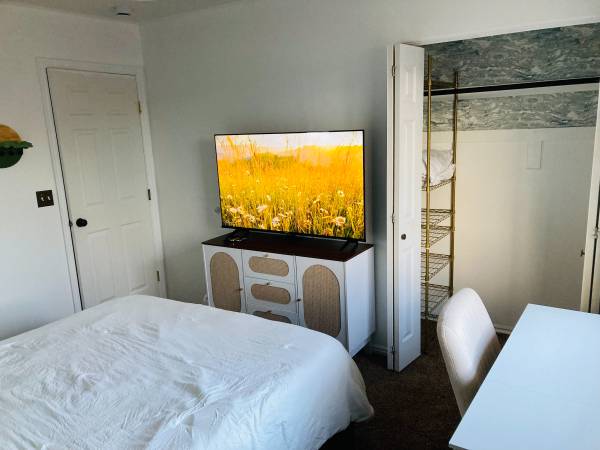 - Hallway bedroom ($675/mo./$500 deposit, available Dec. 3rd): Share hallway bathroom with 1 other female tenant. Furnished with Queen bed, dresser, TV, desk with chair. Pics of room are shown.