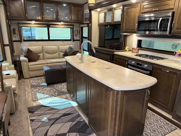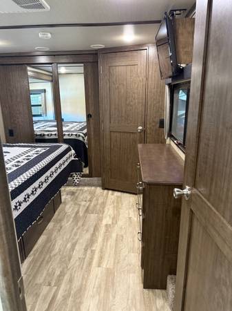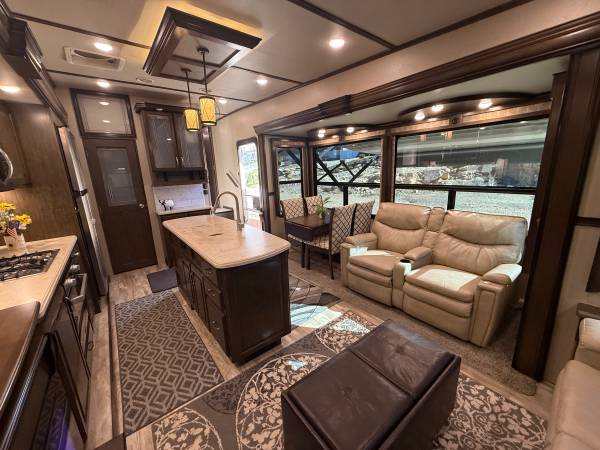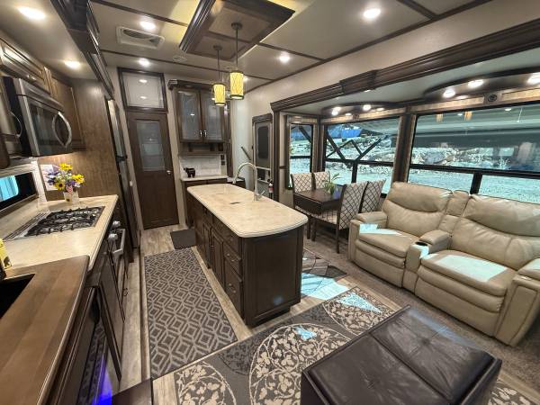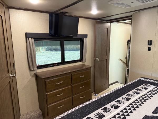 Fifth wheel has 3 Furrion backup cameras. 200ah LifePo4 battery + Victron shunt with 200W solar suitcase. Roadmaster slipper springs with shocks. Central vacuum, fireplace, king bed, 2 TVs. Washer/dryer & dishwasher hookups. Heated underbelly & tank heaters (Weather-Tec package). Soft start on living room AC. 2000W inverter.