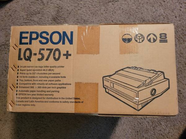 An Epson LQ-570+ Dot Matrix Printer never used, still in the box. This printer is over 20 years old, and cost nearly $500.00 back then, and currently on ebay, you can get the same thing for $585.00. It is an exceptionally good business computer, for multi-part business forms and the like. I am asking $300.00 or best offer. I will include a new cable with it, but you would need an adapter for modern computers.