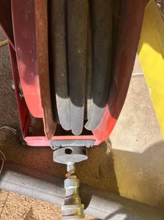 50' HIGH PRESSURE HOSE AND SPRING ACTIVATED REEL, GREAT WORKING ORDER, PERFECT FOR SERVICE TRUCK GREASE POT. RETAIL $575 ASKING $ 350...
