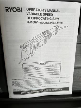 Sawzall/ Reciprocating Saw (corded) Variable Speed 1 - 6 6.0 amps double insulated Storage/Carrying case Used, better than half price off from new, but works like new. ($50) it’s yours!! Call or...