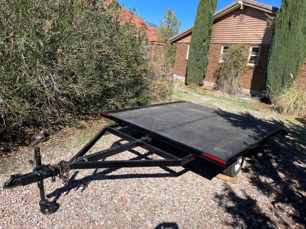 Extra Wide 8' x 9' Tilting Utility Trailer / Toy Hauler. Bed is durable Diamond Plate steel, 8' wide the full 9' length of the bed, and no wheel fenders. Tilts for easy loading of off road vehicles. Overall length is 15'. New hubs, wheels and tires. New heavy duty jack. Weighs 800 lbs. Rides great, super smooth and solid! Looking for $1,995 to cover out costs.