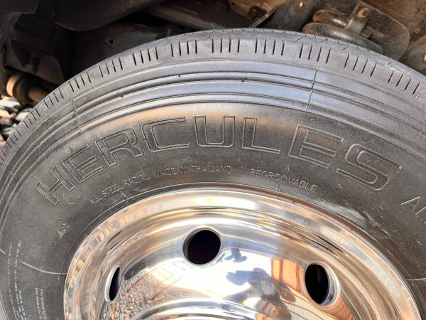 Hercules H901 steel carcass, heavy duty commercial tires for sale. Set of six, approximately 3000 miles of use. Note: one tire has damage on the side wall, which was patched. I don’t consider it a good, full time tire, it could be used for a spare. It works perfectly fine, but consider it a set of five. These tires are very heavy duty, regroovable, very similar to the tires you would see on an 18 wheeler. Load Range F